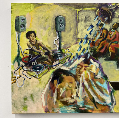 We start a painting with the person, talking about the person, especially if one of them knows them better than the others. Then we stalk them on social media together, and compile images of what we can glean from their life and practice, and aesthetic leanings. Pictures of their work, of them on their birthday, at home with their animals, old photos of their family, something they noticed at their dollar store. We also print pictures of paintings or color palettes we stayed up late or woke up thinking about.